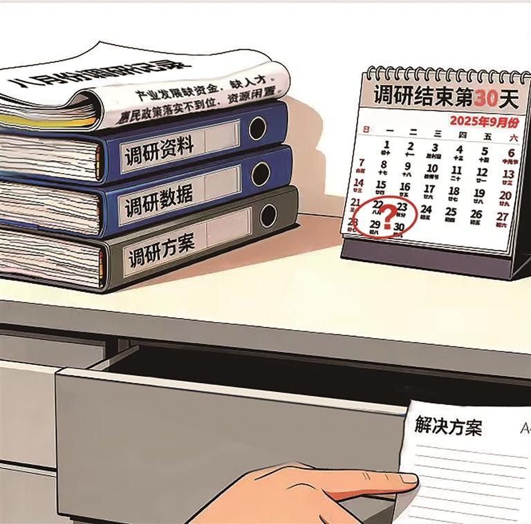 调研不仅是我们党的传家宝,还是破解基层“急难愁盼”的关键抓手。然而现实中,一些上级机关下基层调研时,虽直奔现场、直击问题,记满数据、收录材料,但返回后却迟迟不研究、不解决,最终让这些材料沦为归档的“沉睡文件”。这种“调而不研”的作风,正是形式主义与官僚主义的隐形注脚。一方面,重“走过场”的形式、轻“解难题”的实效,让问题始终停留在“被记录”层面;另一方面,将“带回材料”等同于“完成任务”,不愿花精力深研细究、推动解决,本质是对群众利益的漠视。破局需出实招。当以一抓到底的韧劲推进调研、细化调研制度,明确“谁调研、谁解决”的职责,规定问题处置时限。同时,以群众满意为标尺,增设调研反馈机制,用群众的真实评价检验调研成效。 李小军作