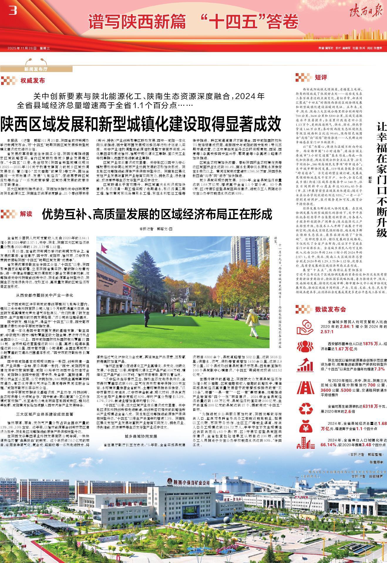 经济发展与群众收入协同发展。在区域协调发展与新型城镇化的推动下,关中平原依托秦创原等平台集聚创新资源,为各类人才投身科创提供广阔舞台;陕北能源化工产业转型升级,为技术工人开辟了施展才干的新空间;陕南走实绿色循环路径,越来越多群众借助生态农业、康养旅游端稳了“金饭碗”。这种优势互补、错位发展的区域格局,不仅优化了全省产业布局,还让万千家庭在家门口安居乐业。全省城乡居民人均可支配收入比由2020年的2.84∶1缩小到2024年的2.57∶1,关中、陕北、陕南三大区域经济总量分别是2020年的1.29、1.73和1.12倍,优势互补、高质量发展的区域经济布局正在形成。