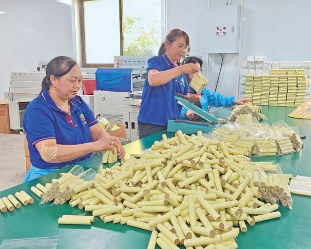 在紫阳县华会实业有限公司车间,工人在打包艾灸条产品(资料照片)。