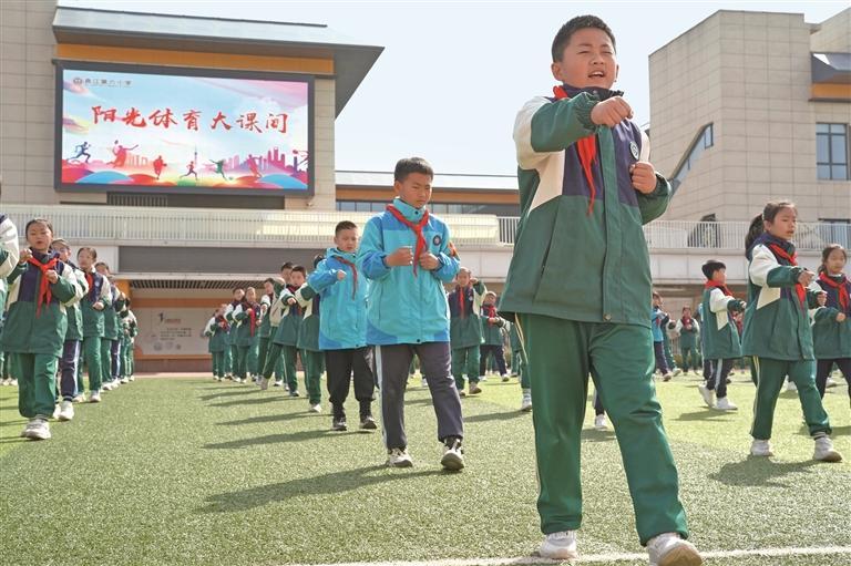 2025年3月21日,在西安市曲江第六小学,学生在阳光体育大课间活动上练习少儿自编版八段锦。 新华社记者 邵瑞摄