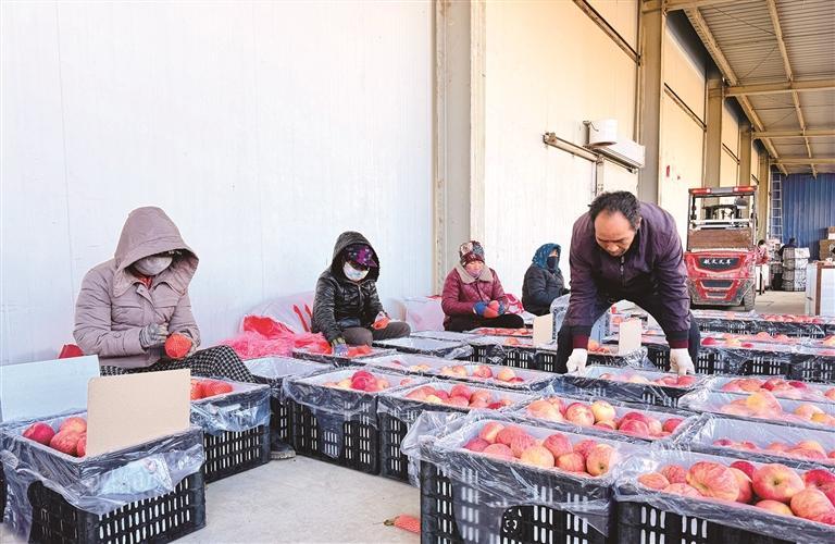 11月19日,在距离该村约6公里的陕西美源现代化农牧业有限公司的包装车间里,工人杨芳梅和吴艳艳等人正在分拣、包装秦脆苹果。这些苹果即将发往浙江温州、江西南昌等地。
