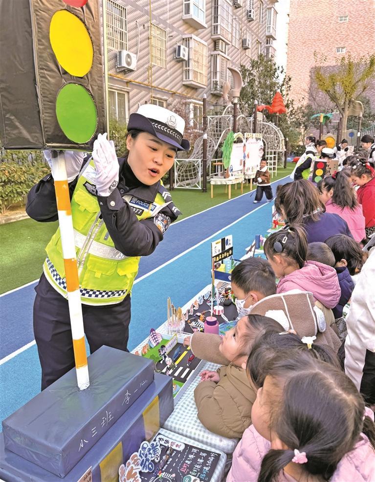 十二月一日,全国交通安全日前夕,渭南市大荔县公安局交通管理大队携手大荔县蓓蕾北城幼儿园举办幼儿交通安全展览。由孩子们与老师创作的交通安全绘画及工艺作品整齐陈列,吸引师生和家长驻足观看。图为大荔县公安局交通管理大队民警与幼儿互动的情景。