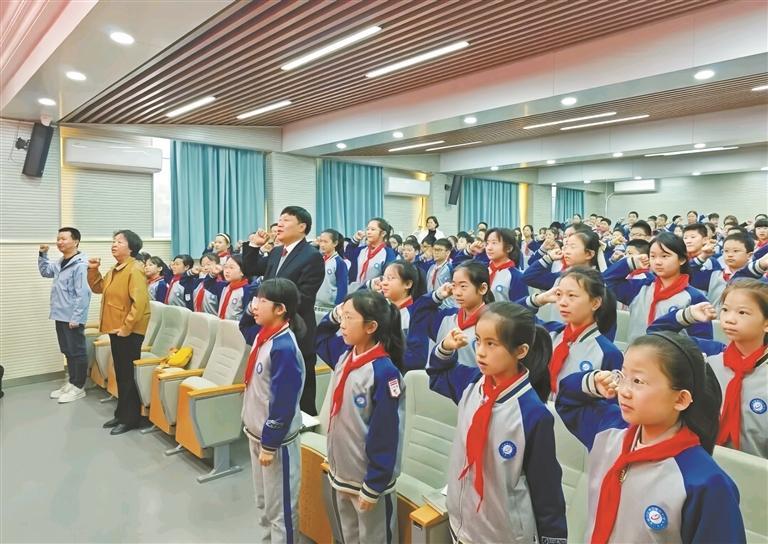 11月6日,西安市关工委法治报告团走进西安理工大学附属小学。图为报告团老师带领学生宣誓(资料照片)。