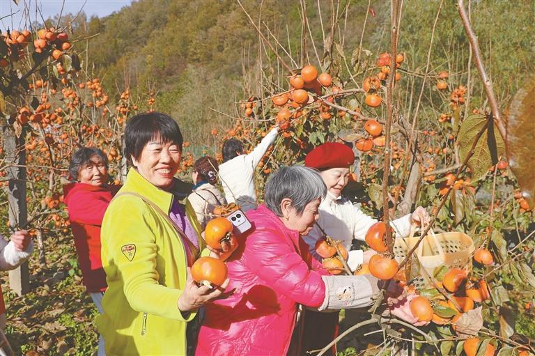 11月24日,在石泉县城关镇丝银坝村甜脆柿种植基地,柿子挂满枝头。游客穿梭在柿树间,一边采摘一边品尝。
