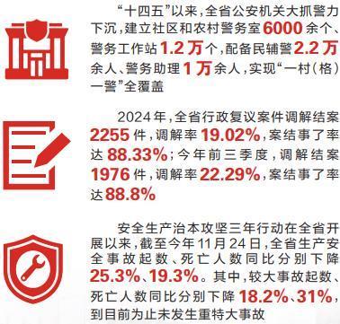 “十四五”以来,全省公安机关大抓警力下沉,建立社区和农村警务室6000余个、警务工作站1.2万个,配备民辅警2.2万余人、警务助理1万余人,实现“一村(格)一警”全覆盖