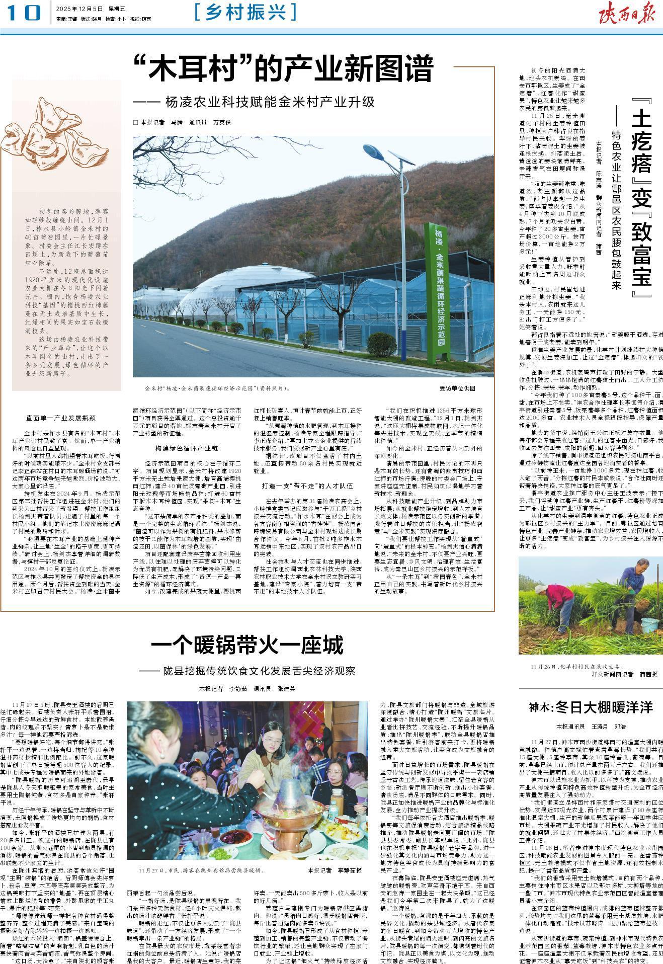 “从葡萄种植的水肥管理,到木耳接种的温湿度控制,杨凌专家全程跟踪指导。”李正森介绍,“再加上龙头企业提供的后续技术服务,我们发展新产业心里有底。”