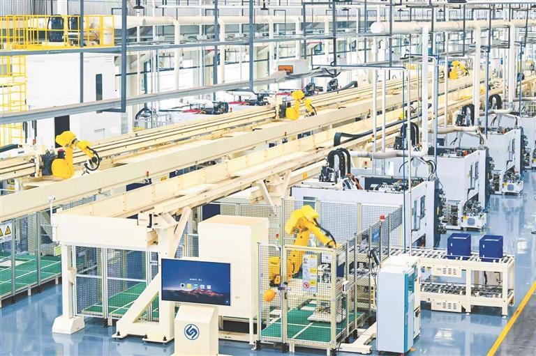 “从原料拿取、上线生产到成品入库,多台工业机器人和智能自动引导小车等自动化设备可精准配合智能化数控机床高效作业,整个过程无需人力干预、辅助,全程实现智能化生产。”该公司总经理助理刘春说,目前,车间整体自动化率超过95%。