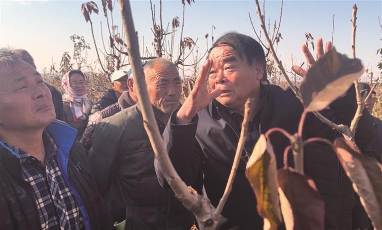 讲座结束后,刘英俊来到产业园的一处露天樱桃园,做现场示范。热情的种植户纷纷上前,将他团团围住,争先恐后地提问:“刘老师,这种枝条需要剪掉吗?”“施肥有什么技巧?”……面对接连不断的问题,刘英俊一一作答。