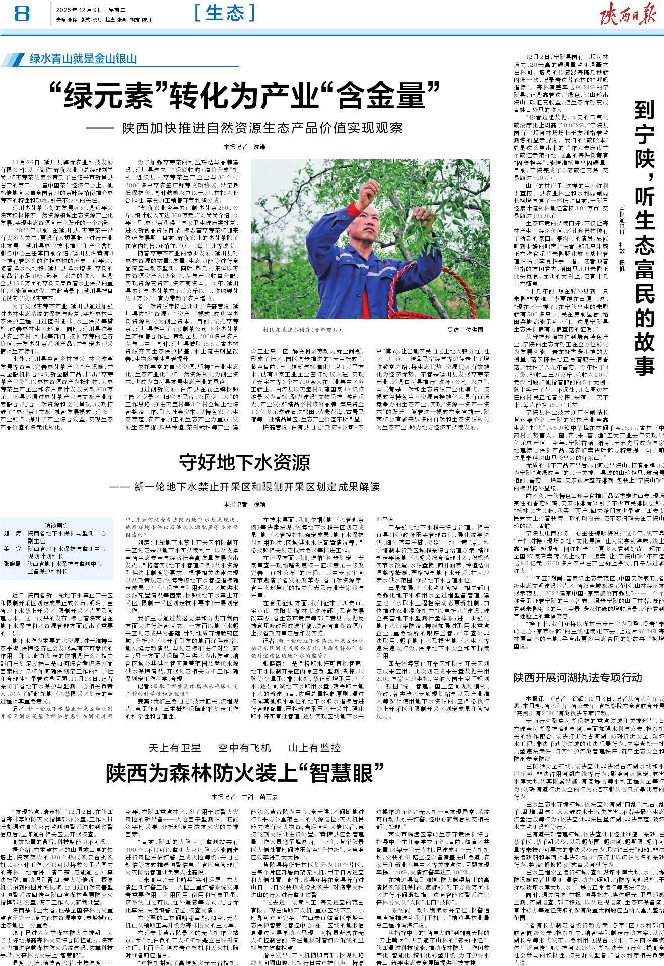 宁陕县林业技术推广站副站长黄运枭介绍,宁陕的农林产业全靠生态“打底”,4.5万箱中华蜂在林间采蜜,5.5万亩林下中药材长势喜人,“菌、药、果、畜、渔”五大产业去年实现12亿元总产值。今年,宁陕香菇、猪苓、天麻先后成为国家地理标志保护产品,菇农们卖货时都要特意提一句:“咱这是秦岭深山里长出来的好东西。”