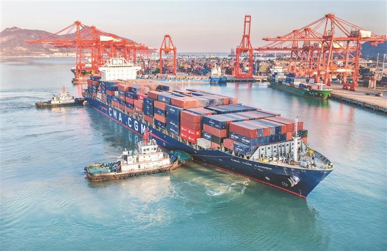 12月5日,一艘大型集装箱船舶驶入江苏连云港港(无人机照片)。
