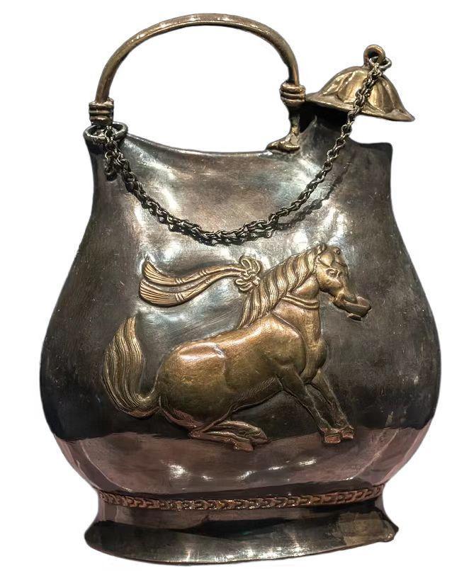 鎏金舞马衔杯纹银壶通高14.8厘米,重549克,为唐代仿皮囊式金银器,纹样精美,具有极重要的历史和艺术价值。