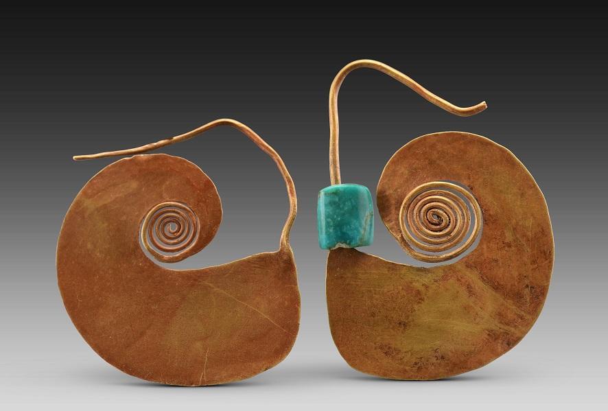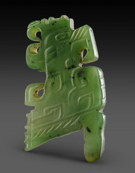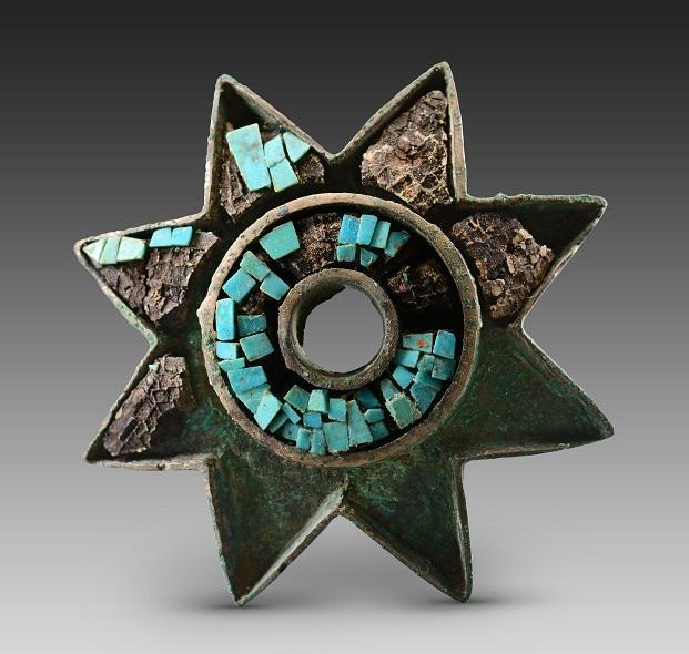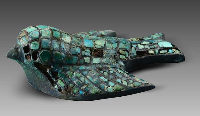 寨沟遗址出土的绿松石铜鸟饰(资料照片)。