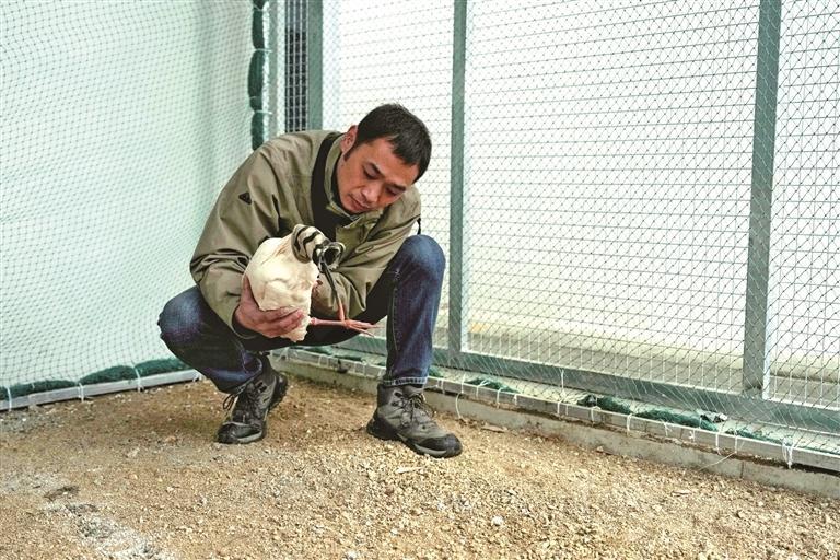 12月5日,在陕西省宁陕朱鹮野化放飞基地管理站,李夏在检查朱鹮伤病的恢复情况。