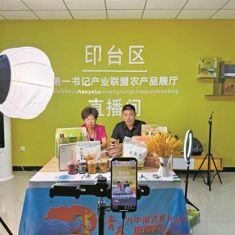 印台区积极拓展网络直播助力乡村振兴发展新思路,主动对接网络消费市场,通过“村党组织书记+驻村第一书记+大学生+志愿者”直播,让手机变成新农具、数据变成新农资。