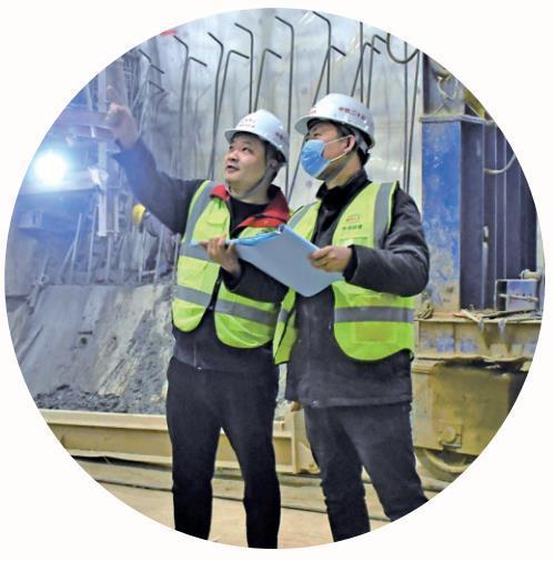 施工期间,姜函(左一)和同事在隧道内记录数据。 中铁二十局供图