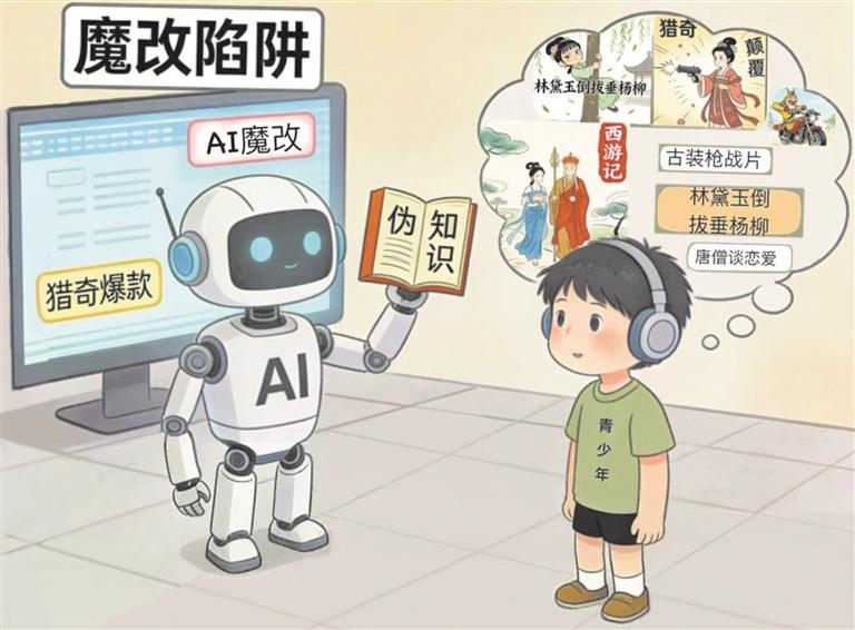近段时间,各类“AI魔改”经典作品的短视频在网络上传播,以颠覆原作的荒诞剧情博取流量,引发广泛关注与争议。“AI魔改”为了追求猎奇效果,肆意解构经典内核,不仅涉嫌侵犯著作权与作品完整权,还会误导青少年的文化认知,扭曲大众的审美取向。