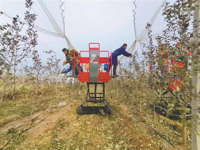 白水县农业技术人员在履带式升降作业平台上剪枝(资料照片)。 本报通讯员 董张曼摄