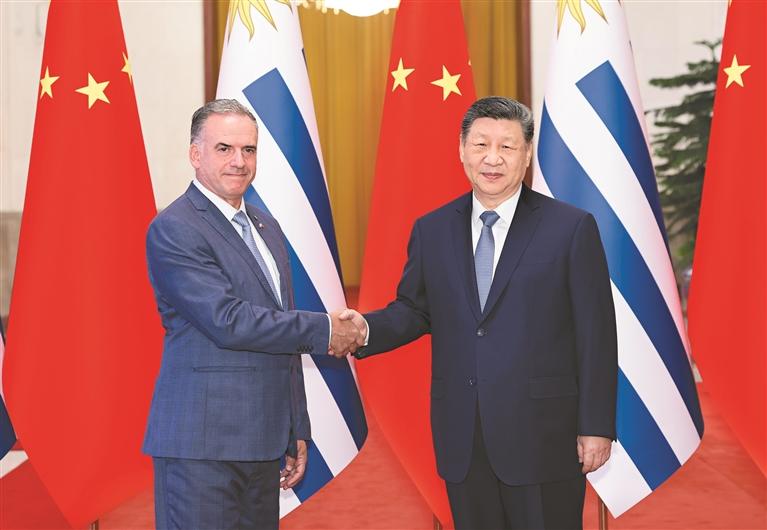 习近平指出,当今世界正处于百年未有之大变局,国际形势变乱交织,单边霸凌愈演愈烈,中方支持乌拉圭接任“77国集团和中国”轮值主席国,愿与乌方加强全球南方团结协作,共同推进平等有序的世界多极化、普惠包容的经济全球化,携手并进、共谋发展,为构建人类命运共同体作出更大贡献。中方始终重视中拉关系,支持拉美和加勒比国家维护自身主权、安全、发展利益,支持乌拉圭接任拉美和加勒比国家共同体以及南方共同市场轮值主席国,愿同乌方和地区国家推动共建中拉命运共同体走深走实。