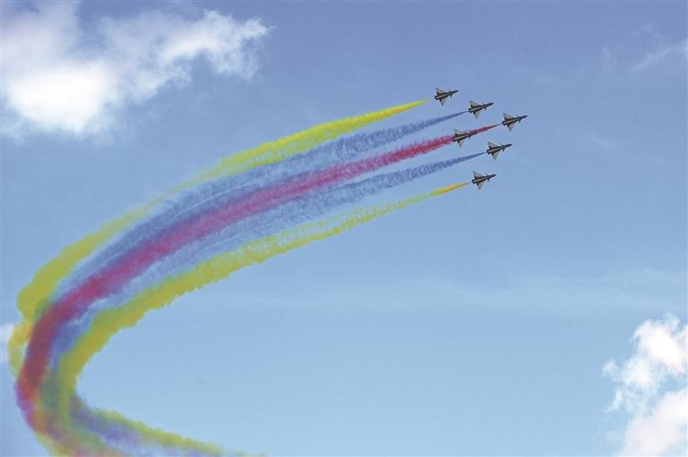 为期6天的第十届新加坡航展3日开幕。应邀参展的中国空军八一飞行表演队在开幕式上进行飞行表演,6架歼-10表演机在海天之间上演了一场“空中芭蕾”。这是中国空军八一飞行表演队换装歼-10C后首次公开亮相新加坡。