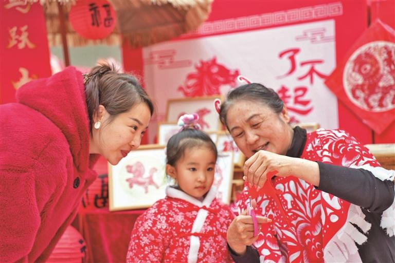 2月3日,渭南非遗新春市集现场热闹非凡,特色好物琳琅满目。本次市集活动由渭南市文化艺术中心策划推出,汇集22个特色摊位,涵盖非遗、文创、手工等内容,将持续至3月3日。图为活动现场,文化志愿者将剪纸作品赠送给市民。 本报记者 耿杨洋摄