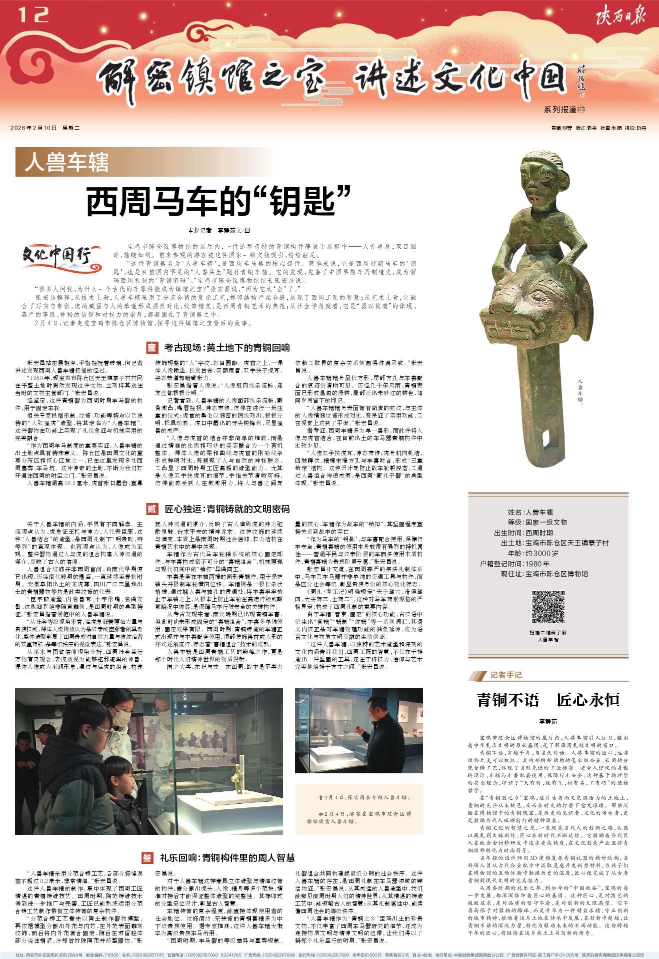 “这件青铜器名为‘人兽车辖’,是西周车马器的核心部件。简单来说,它是西周时期马车的‘钥匙’,也是目前国内罕见的‘人兽共生’题材青铜车辖。它的发现,完善了中国早期车马制造史,成为解码西周礼制的‘青铜密码’。”宝鸡市陈仓区博物馆馆长张宏昌说。