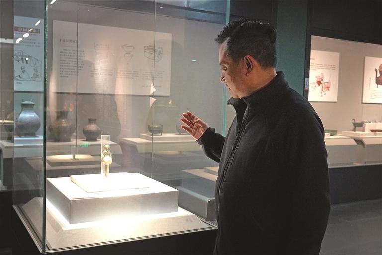张宏昌站在展柜旁,手指轻抚着玻璃,向记者讲述发现西周人兽车辖挖掘的经过。