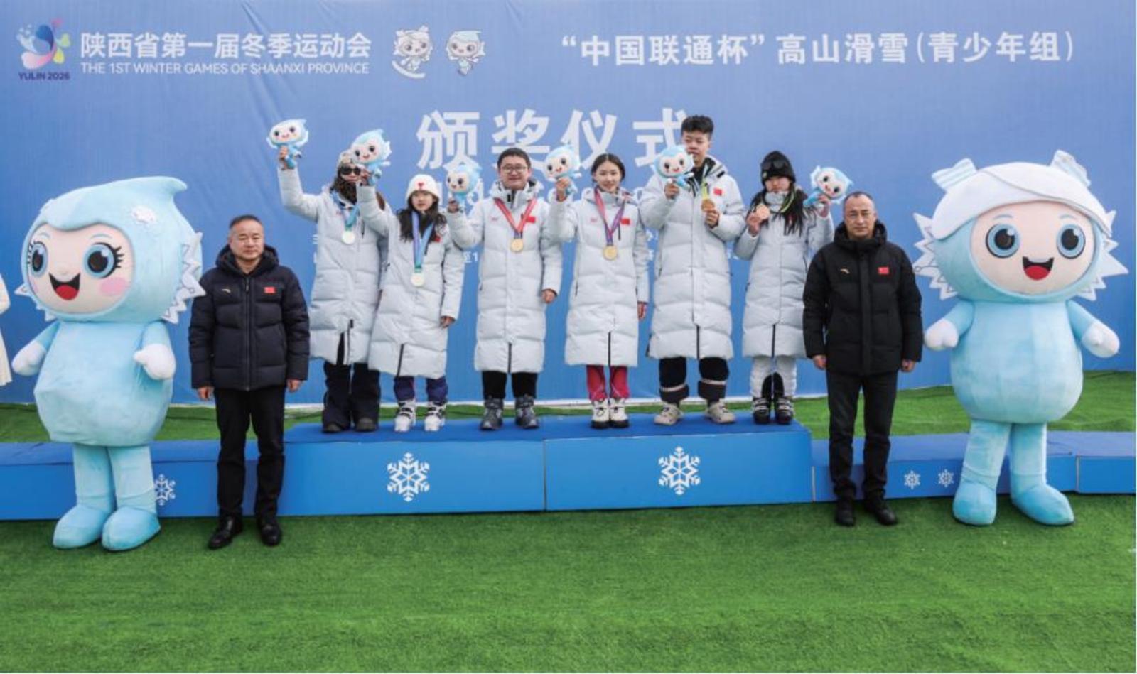 省一冬会“中国联通杯”高山滑雪比赛在神木市碧麟湾滑雪场举行。图为颁奖现场。 中国图片社供图