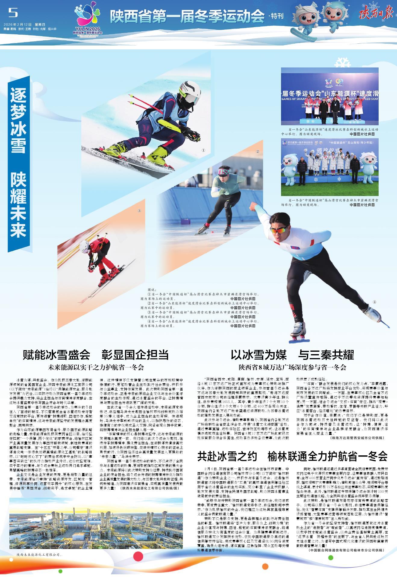 冰雪为媒,共赴盛会。作为扎根三秦大地、深耕能源领域的省属国有企业,陕西未来能源化工有限公司(以下简称“未来能源”)始终以“保障能源安全、服务地方发展”为己任,以实际行动为陕西省第一届冬季运动会提供鼎力支持,将企业担当与体育精神深度融合,在这场冰雪盛宴中书写国企使命与时代华章。