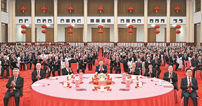 人民大会堂宴会厅灯光璀璨、喜气洋洋,各界人士2000多人欢聚一堂、共迎佳节,现场洋溢着欢乐祥和的节日气氛。