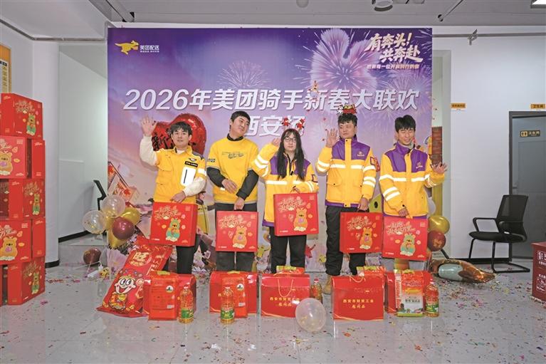 二月五日,外卖骑手在西安市雁塔区一处美团骑手之家参加新春大联欢。