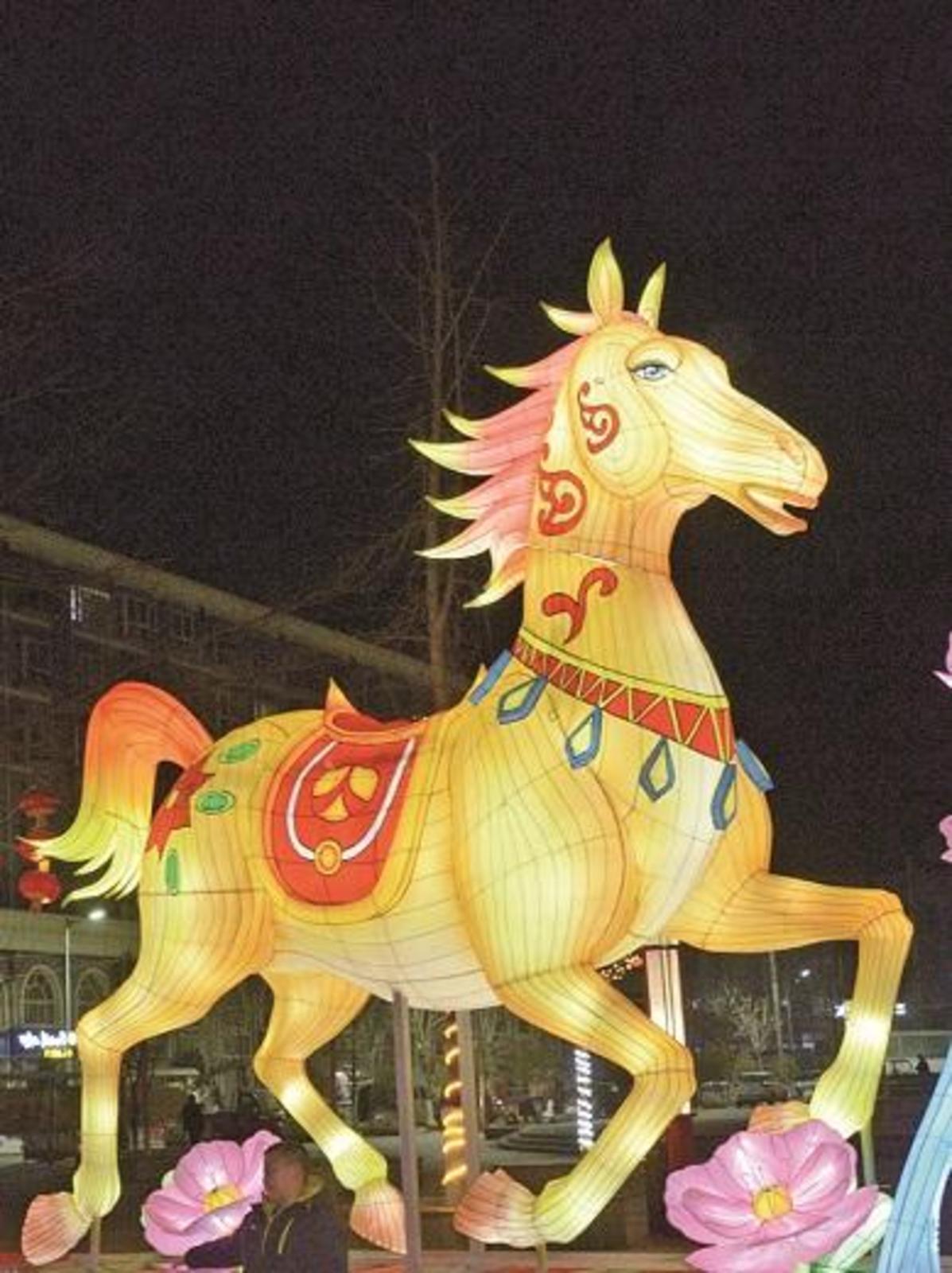 2月12日,市民在延长县石油广场《奔马》大型灯组景观前游览。 本报通讯员 王福建摄