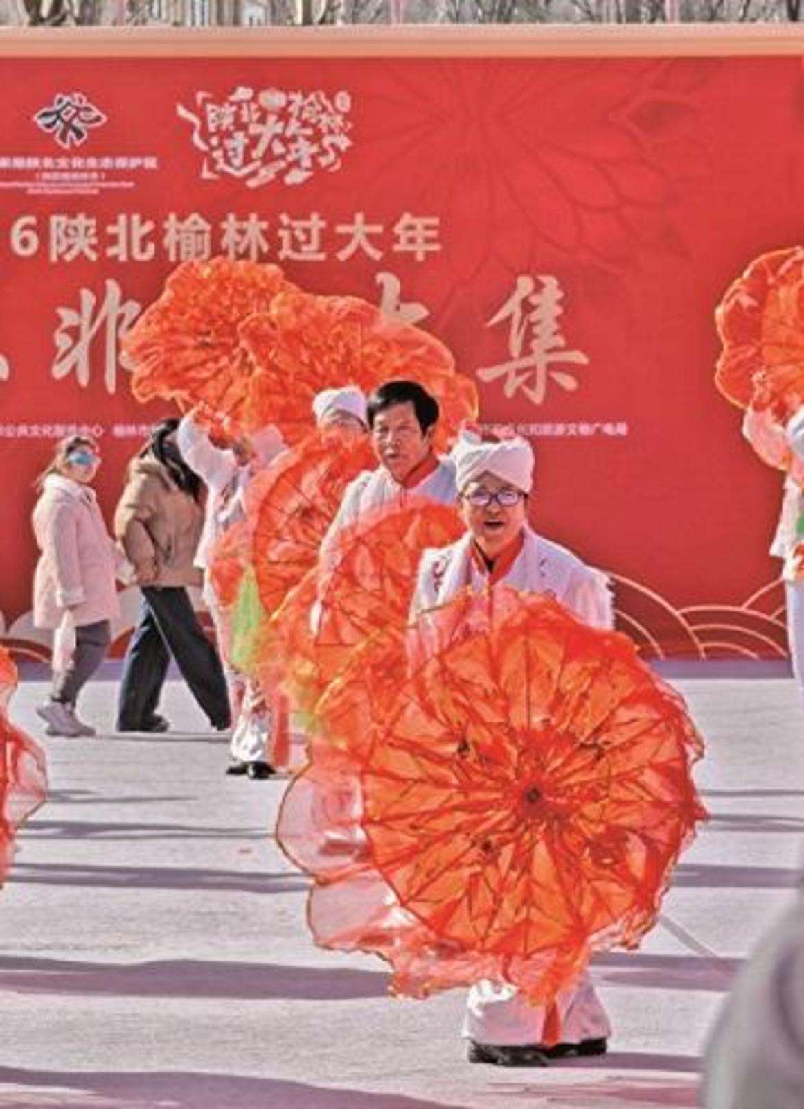 2月12日,榆林市世纪广场年货市集上的表演吸引市民驻足观看。 本报记者 王熙摄