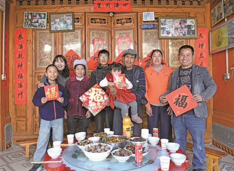 2月16日,在云南省大理白族自治州剑川县马登镇文屏村,一家人在吃“团圆饭”前合影。 新华社发(赵庆祖摄)
