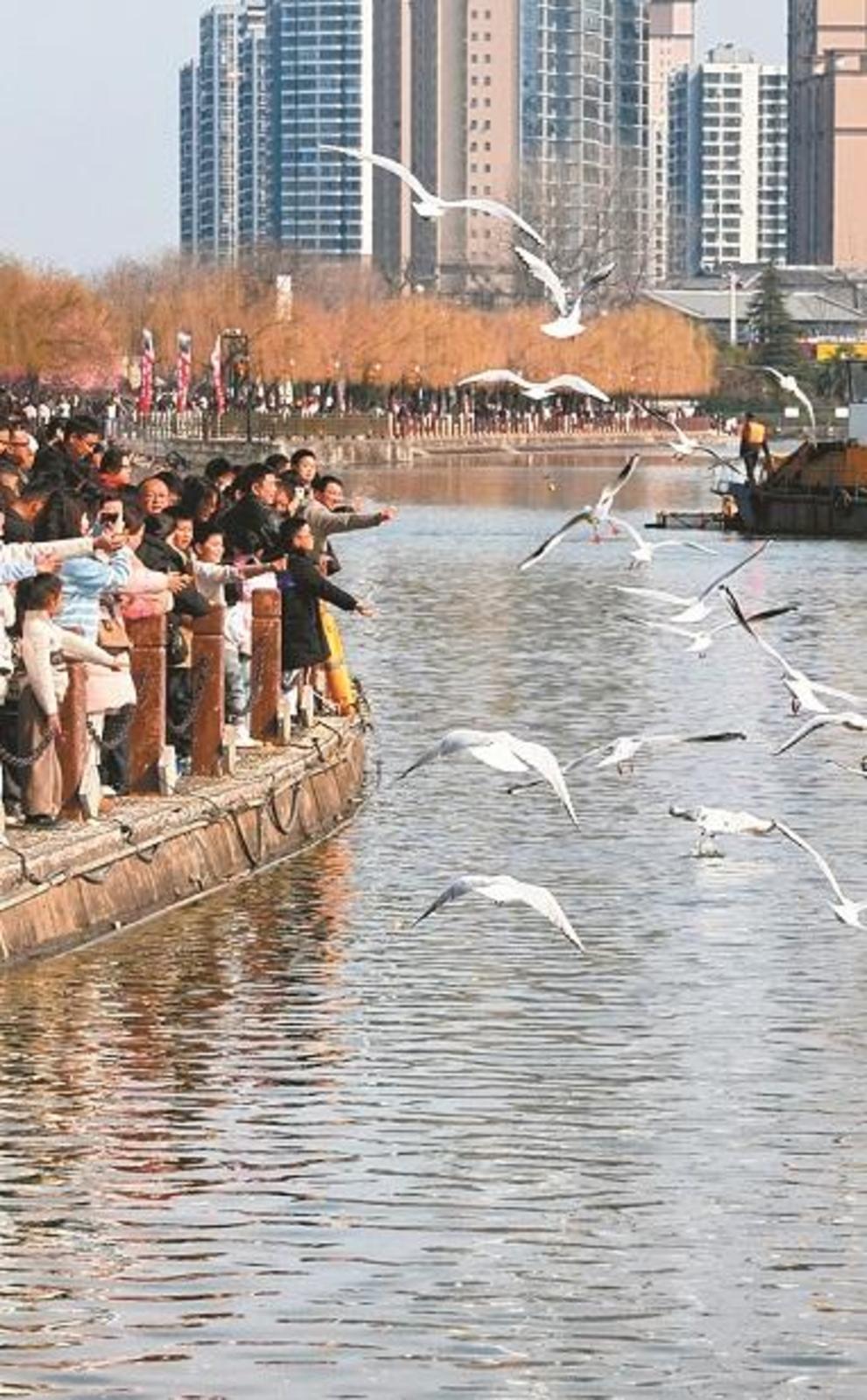 2月18日,汉中市天汉湿地公园的红嘴鸥吸引许多游客围观。 本报记者 许奥博摄