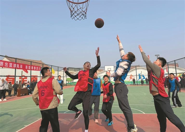 2月17日,大荔县双泉镇西庄村村民以一场篮球赛喜迎新春。全村老少欢聚一堂,热闹非凡。 本报通讯员 李世居摄