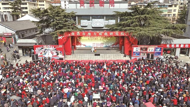 “银灯结彩花成双,玉蝉移步过东墙。”舞台上,戏曲演员表演商洛花鼓《屠夫状元》选段。舞台周围,群众或站或坐,时不时拿出手机记录演出的精彩瞬间,叫好声、掌声不断。