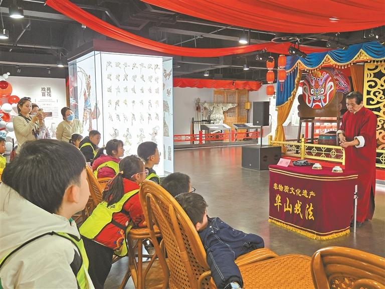 二月十日,孩子们在陕西省文化馆曲江馆区的非物质文化遗产体验中心观看华山戏法,感受非遗魅力。