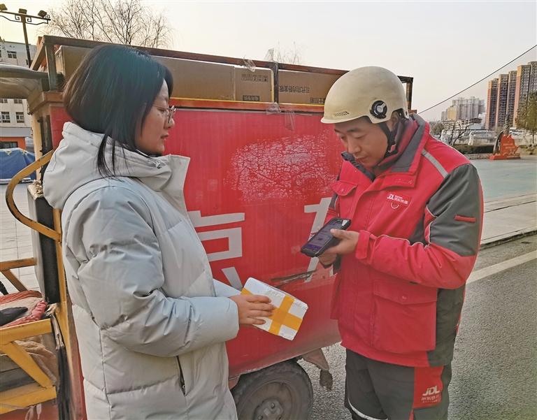 2月9日,清涧县快递小哥惠诚(右)为居民送快递。