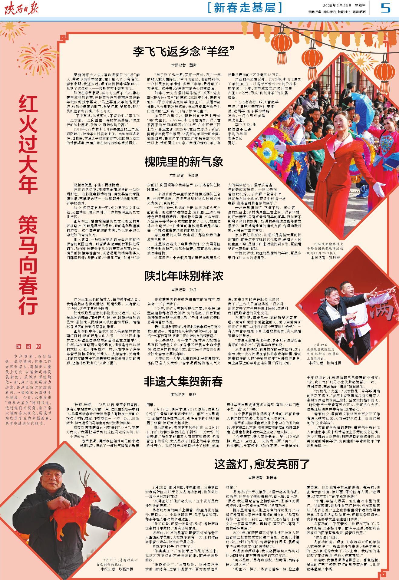 岁序更新,满目新景。春节期间,党报工作者回到家乡,用脚步丈量故土变化,以笔触定格发展新貌。从城乡面貌焕然一新,到产业发展活力迸发,再到民俗文化绽放新彩,一幅幅振兴图景生动铺展。今日,本报推出“新春走基层”特别报道,透过他们的视角,看三秦大地的喜人变化,展现百姓安居乐业的幸福画卷,感受奋进的时代脉动。