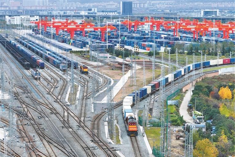 2025年11月17日,X9043次中欧班列(西安)驶出西安国际港站,驶向阿塞拜疆首都巴库(无人机照片)。