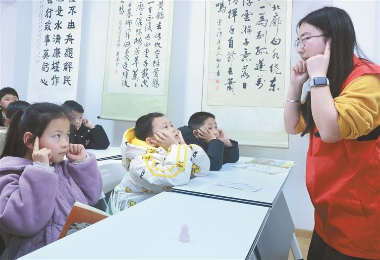 3月2日,在武汉市武昌区黄鹤楼街道读书社区,志愿者指导小朋友练习耳保健操。