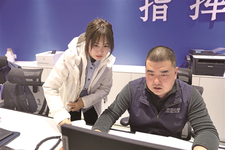 2月16日,本报记者苗雨蒙(左)在省应急管理厅应急指挥中心采访(资料照片)。 本报通讯员 宋洋摄