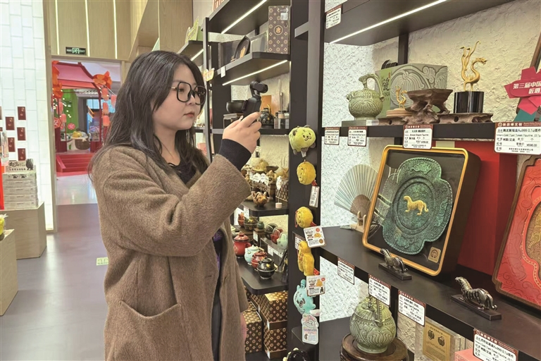 2月12日,本报记者赵茁轶在文创店拍摄耀州窑瓷器相关视频(资料照片)。 本报记者 孙亚婷摄
