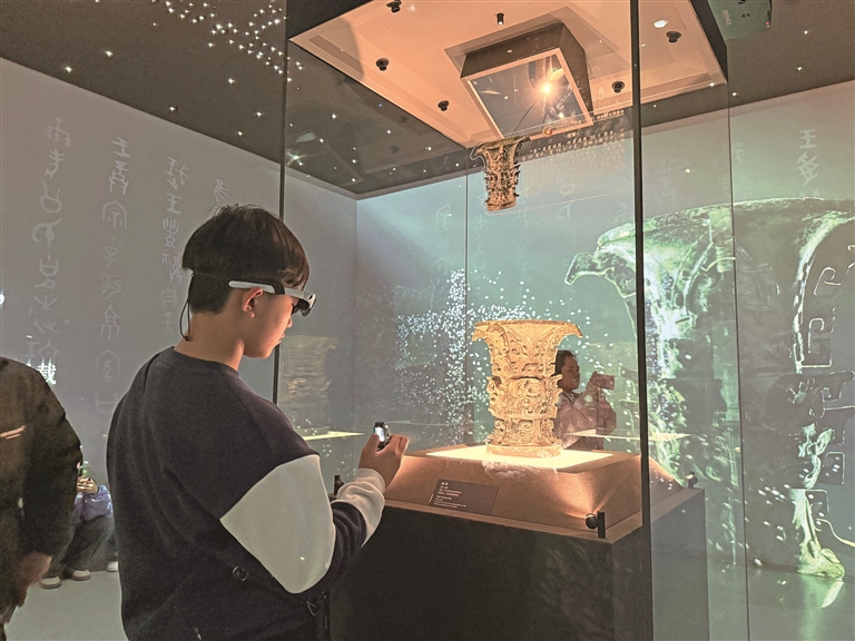 3月1日,在宝鸡青铜器博物院,游客体验AR眼镜导览。 本报记者 付玉玮摄