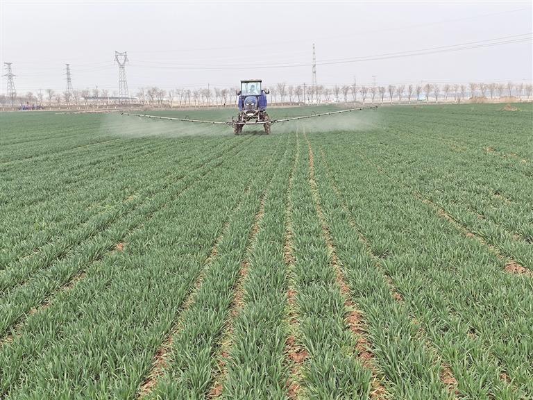 当前,小麦陆续返青,永寿县农业技术推广中心技术人员深入田间,指导群众科学施肥、施药。图为3月4日,永寿县农业技术推广中心组织自走式植保机械在监军街道城关村小麦田间开展除草作业。 本报通讯员 李建龙摄