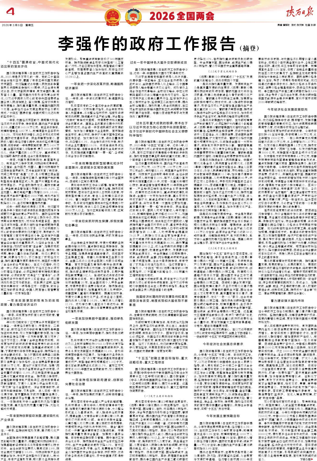 国务院总理李强5日在政府工作报告中指出,今年是“十五五”开局之年。做好政府工作,要在以习近平同志为核心的党中央坚强领导下,以习近平新时代中国特色社会主义思想为指导,深入贯彻党的二十大和二十届历次全会精神,认真落实党的二十届四中全会和中央经济工作会议部署,完整准确全面贯彻新发展理念,加快构建新发展格局,着力推动高质量发展,坚持稳中求进工作总基调,统筹国内国际两个大局,更好统筹发展和安全,实施更加积极有为的宏观政策,增强政策前瞻性针对性协同性,持续扩大内需、优化供给,做优增量、盘活存量,因地制宜发展新质生产力,纵深推进全国统一大市场建设,持续防范化解重点领域风险,着力稳就业、稳企业、稳市场、稳预期,推动经济实现质的有效提升和量的合理增长,保持社会和谐稳定,实现“十五五”良好开局。