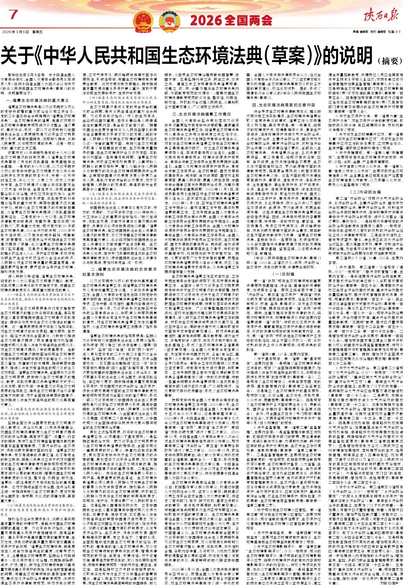2026年1月30日,全国人大宪法和法律委员会召开会议,根据全国人大常委会审议意见、代表研读讨论中提出的意见和各方面的意见,对生态环境法典草案作了进一步修改完善。全国人大宪法和法律委员会认为,经过全国人大常委会多次会议审议、广泛征求意见和反复修改完善,生态环境法典草案充分吸收各方面的意见建议,已经比较成熟。据此,形成了提请本次会议审议的《中华人民共和国生态环境法典(草案)》。