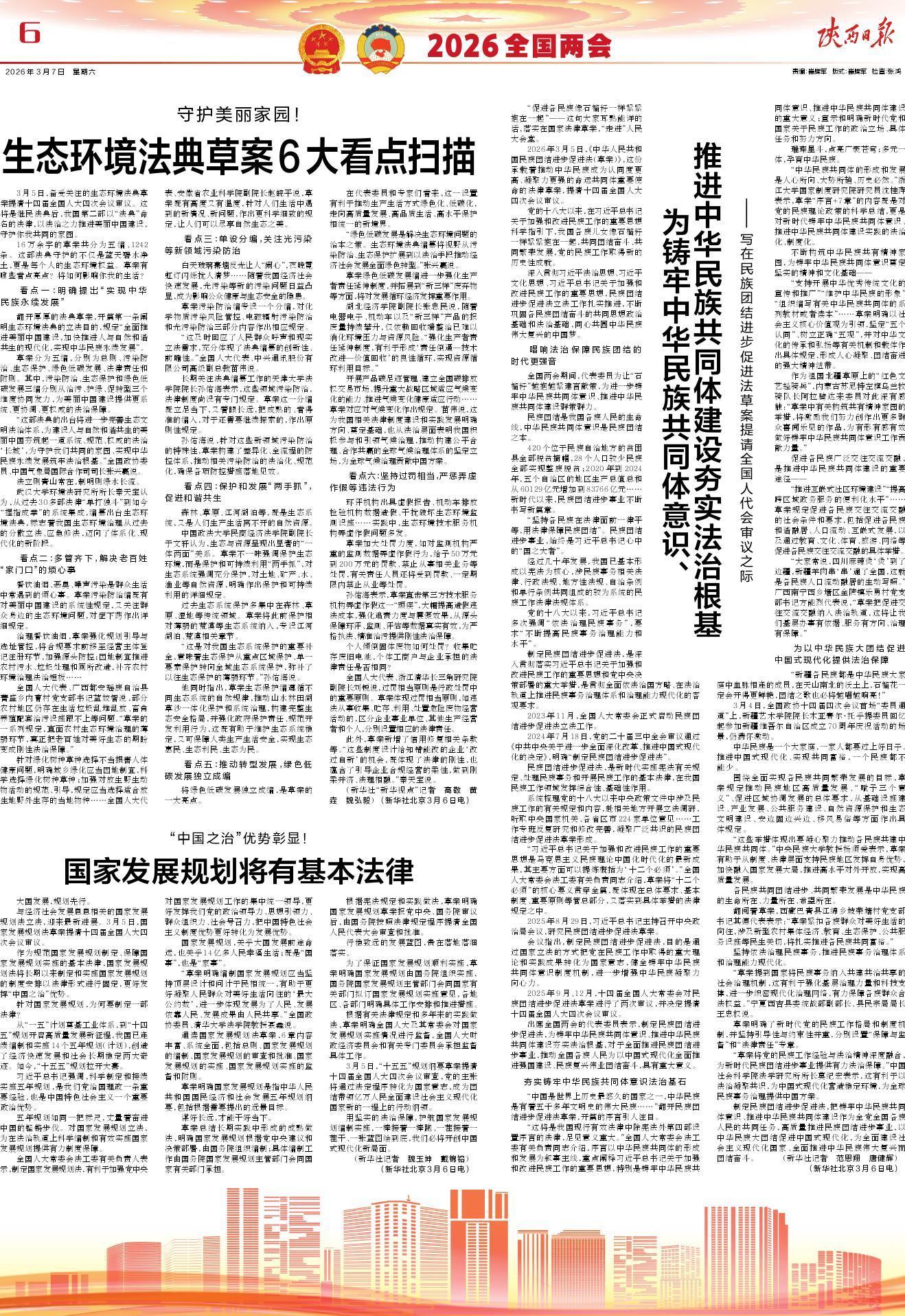 “这部法典的出台将进一步完善生态文明法治体系,为建设人与自然和谐共生的美丽中国夯筑起一道系统、规范、权威的法治‘长城’,为守护我们共同的家园、实现中华民族永续发展筑牢法治根基。”全国政协委员、中国气象局国际合作司司长张兴赢说。