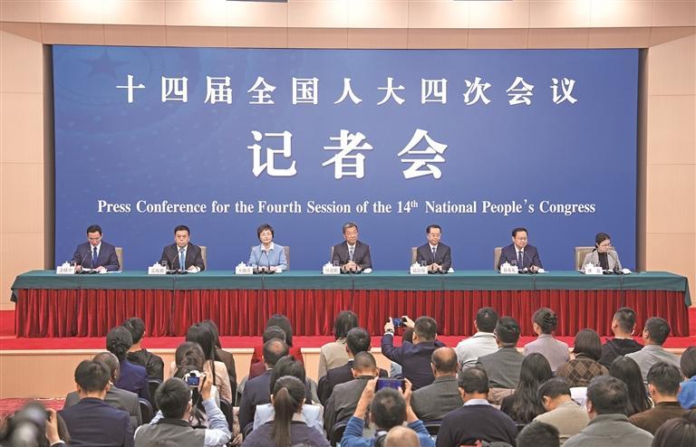 三月七日,十四届全国人大四次会议在北京梅地亚中心新闻发布厅举行民生主题记者会。新华社记者 王曦摄