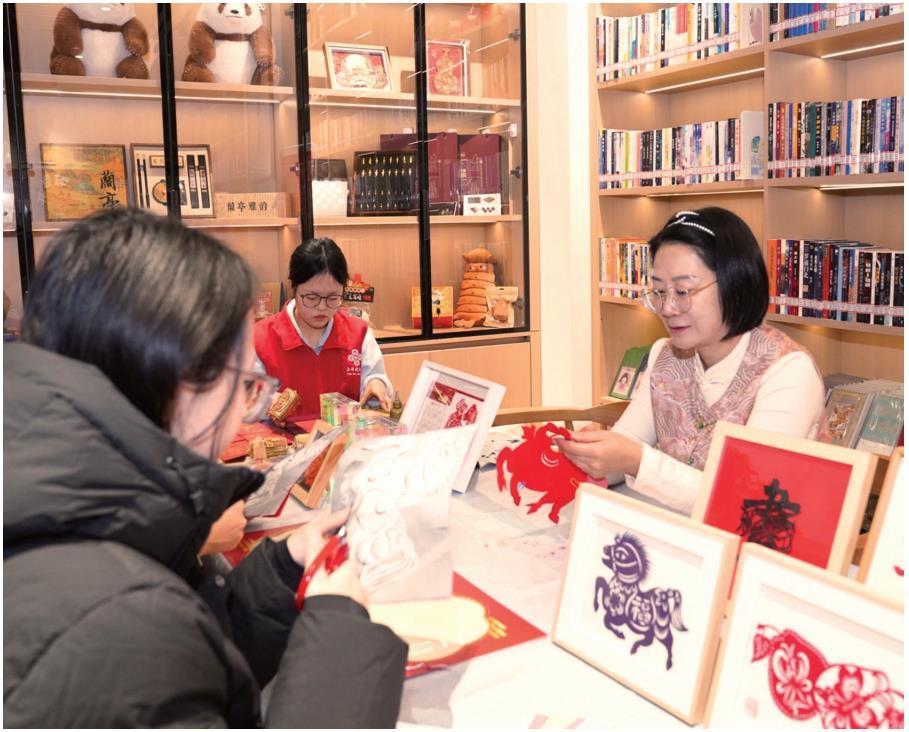 游客在陕西省图书馆“只此长安·秦韵书房”文旅融合服务体验空间体验剪纸(资料照片)。 本报记者 柏桦摄
